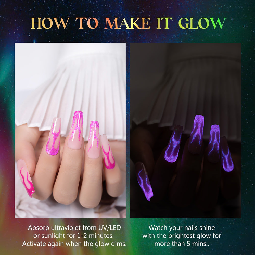 Dive into a chilling electric blue that glows with eerie brilliance. Perfect for bold night looks and Halloween parties. Phantom Blue charges under light and transforms into a radiant glow in the dark.